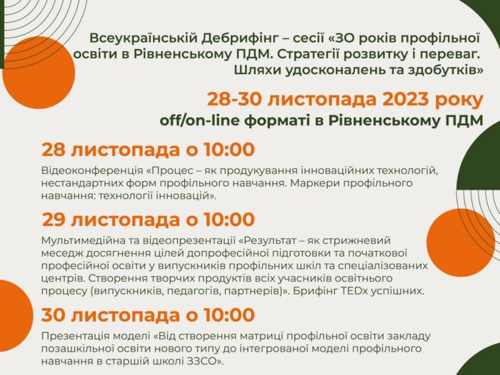 Рівненський ПДМ вже сьогодні готовий ділитися своїм досвідом з ЗЗСО. Саме цьому в тому числі і присвячено Всеукраїнська Дебрифінг – сесія «ЗО років профільної освіти в Рівненському ПДМ. Стратегії розвитку і переваг. Шляхи удосконалень та здобутків», яка відбудеться 28-30 листопада 2023 року в off/on-line форматі в Рівненському ПДМ.