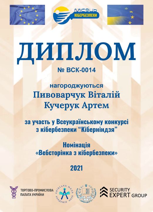 Вихованці IT Школи ПДМ Віталій Пивоварчук та Артем Кучерук у стислий термін завершили проєкт веб сторінки за темою “Кібербезпека”, і серед 109 інших робіт з України, витримали конкуренцію та здобули 14-те місце, а також опинились серед числа 19 проєктів , що отримали диплом учасників які набрали 50%+ балів оцінювання.