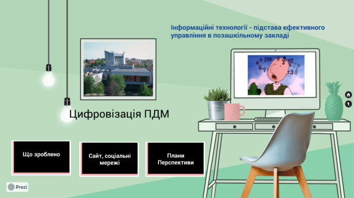 Рівненський Палац вже розпочав реалізацію плану «Цифровий ПДМ», що передбачає 4 етапи діджиталізації. Це розробка концепції, створення цифрового контенту, навчання педагогів з цифрової грамотності, мережевого етикету та кібербезпеки, а також створення потужної внутрішньої мережі.
