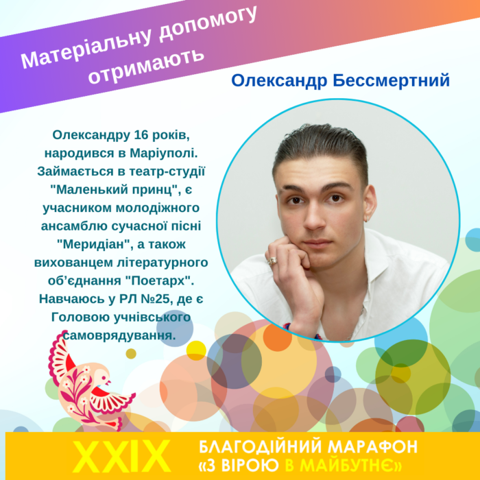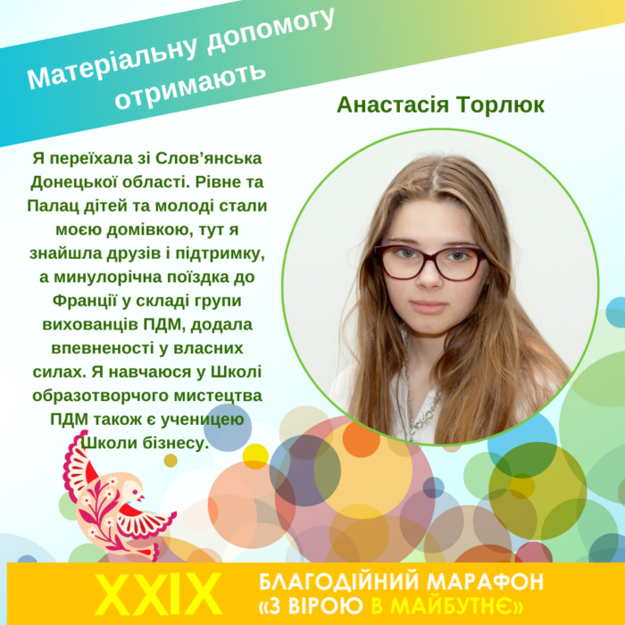 Я – учениця 10 класу РЛ №7. Амбітна і маю багато мрій, прагну поєднувати у своєму житті дві зовсім різні сфери – танці і науку. Я – випускниця Школи сучасної хореографії ПДМ. Танець навчив мене відданості, дисциплінованості та роботі в команді, математика вчить системності, аналізу і розв’язанню складних завдань. Вважаю своїм обов’язком, як дитина Героя, який віддав своє життя За Україну, отримавши вишу освіту, зробити так, щоб наша країна стала ще кращою. Буду змінювати наше місто і будувати більше будівель, на зразок ПДМу, тому що Палац – це місце, де діти розвиваються та реалізуються у житті.