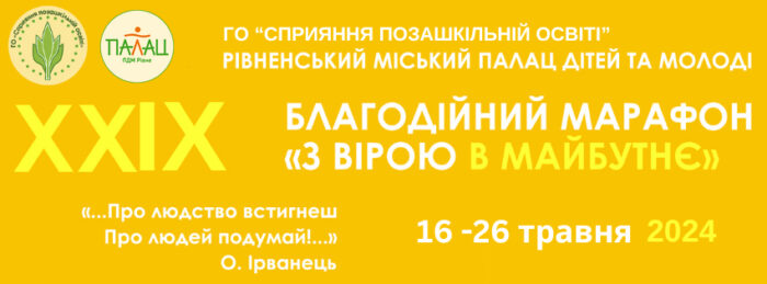 Благодійний Марафон «З вірою в майбутнє», започаткований в 1996 році щорічно організовується та проводиться Рівненським міським Палацом дітей та молоді та ГО «Сприяння позашкільній освіті» з метою соціальної і матеріальної підтримки обдарованих дітей ПДМ, надання можливості популяризації творчих проєктів художніх колективів, профільних шкіл. Благодійний марафон сприяє єднанню учасників освітнього процесу, соціальних партнерів, спонсорів, представників муніципальної влади та територіальної громади Рівного.