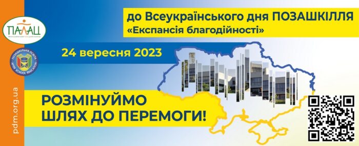 24 вересня до Всеукраїнського Дня позашкілля Палац дітей та молоді проводить акцію “Експансія благодійності”. Мета збір коштів на розмінування шляху для просування контрнаступу ЗСУ. Кошти будуть акумулюватися на рахунку ГО “Сприяння позашкільній освіті” (рахунок ГО «Сприяння позашкільній освіті та соціальному захисту дітей і підлітків ПДМ»: UAH р/р UA 47 300346 0000026005022684001,в АТ «СЕНС БАНК» ЄДРПОУ 22566386) та потім будуть перераховані у Фонд “Повернись живим”.